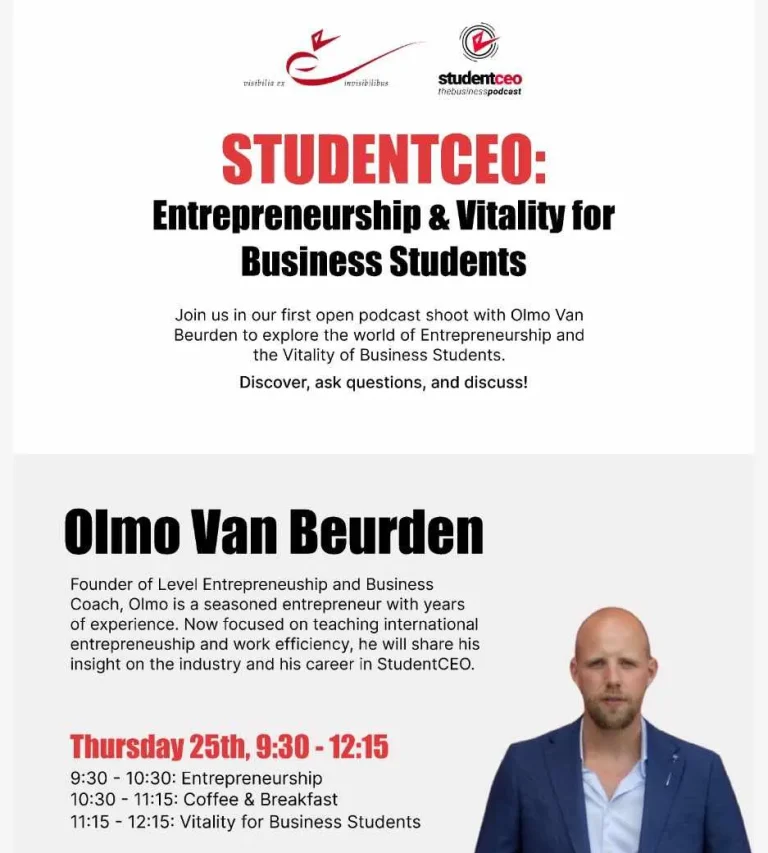 Level Entrepreneurship is excited to share the news of our recent participation in a special podcast series hosted by the European School of Economics (ESE) in Madrid. On Thursday, Olmo van Beurden, our founder, engaged in a compelling discussion on two vital topics: Entrepreneurship and Vitality for Business Students. Guided by Clelia Mosca from ESE, these insightful conversations promise to offer valuable insights to professionals and students alike.