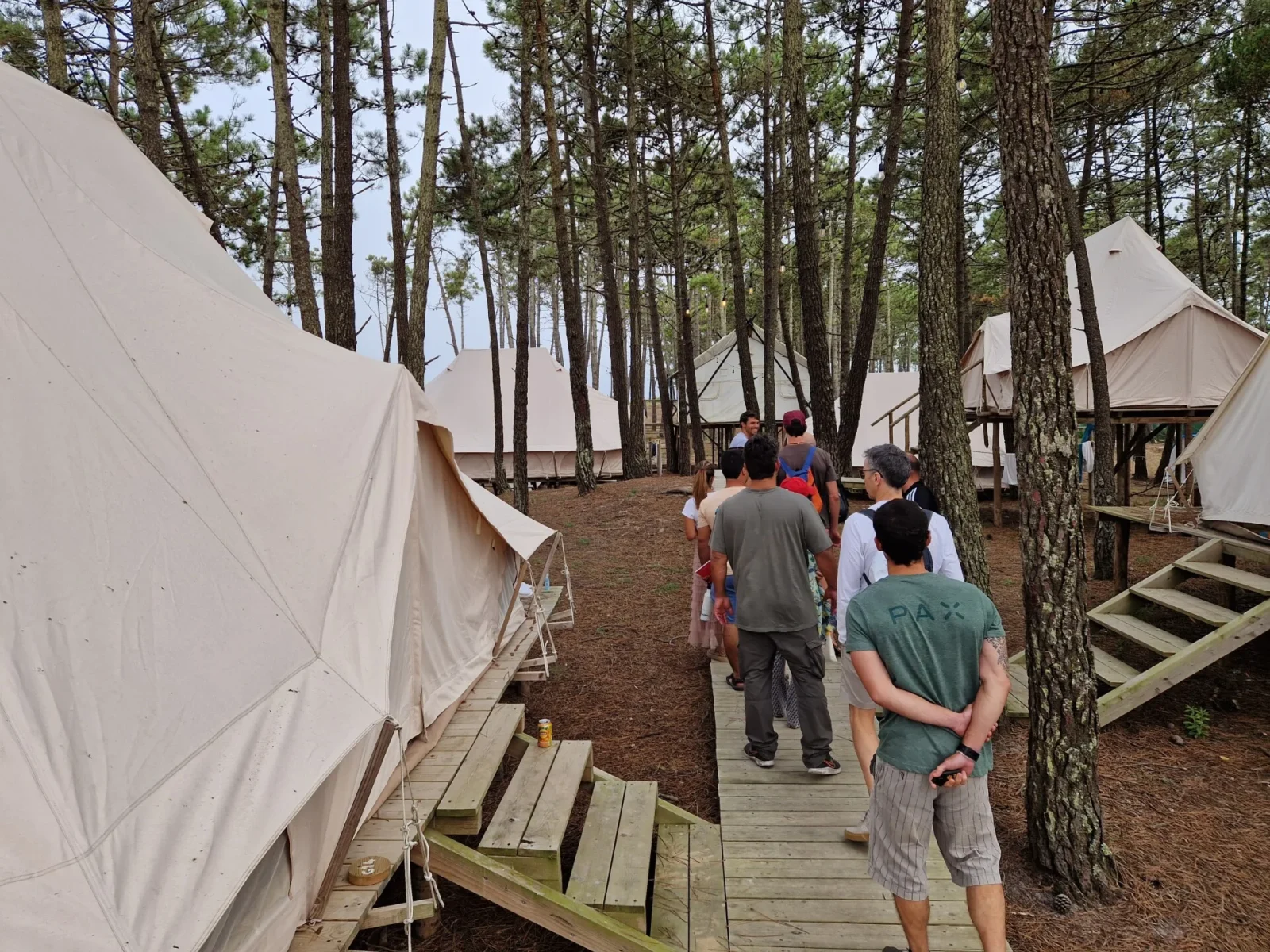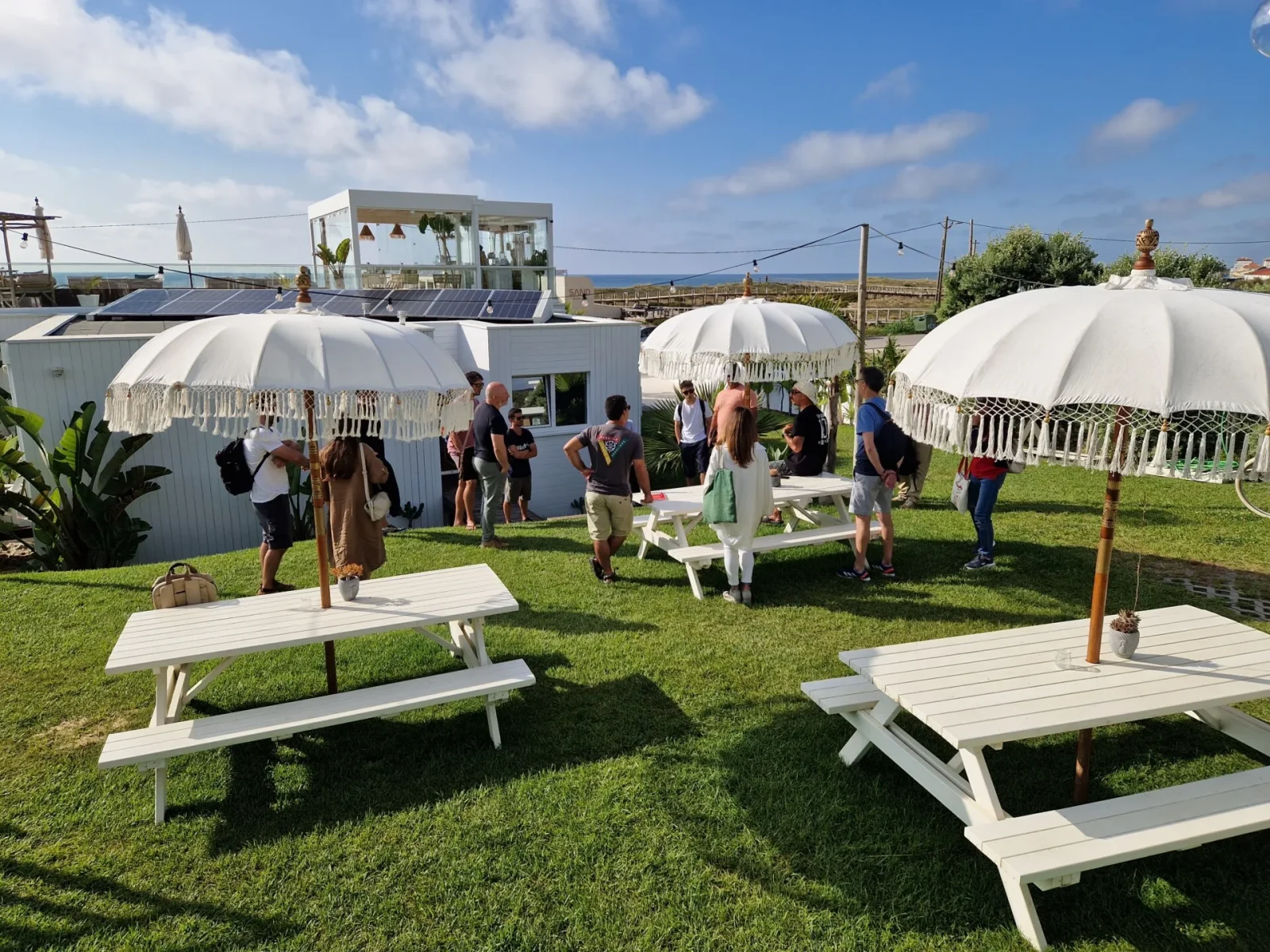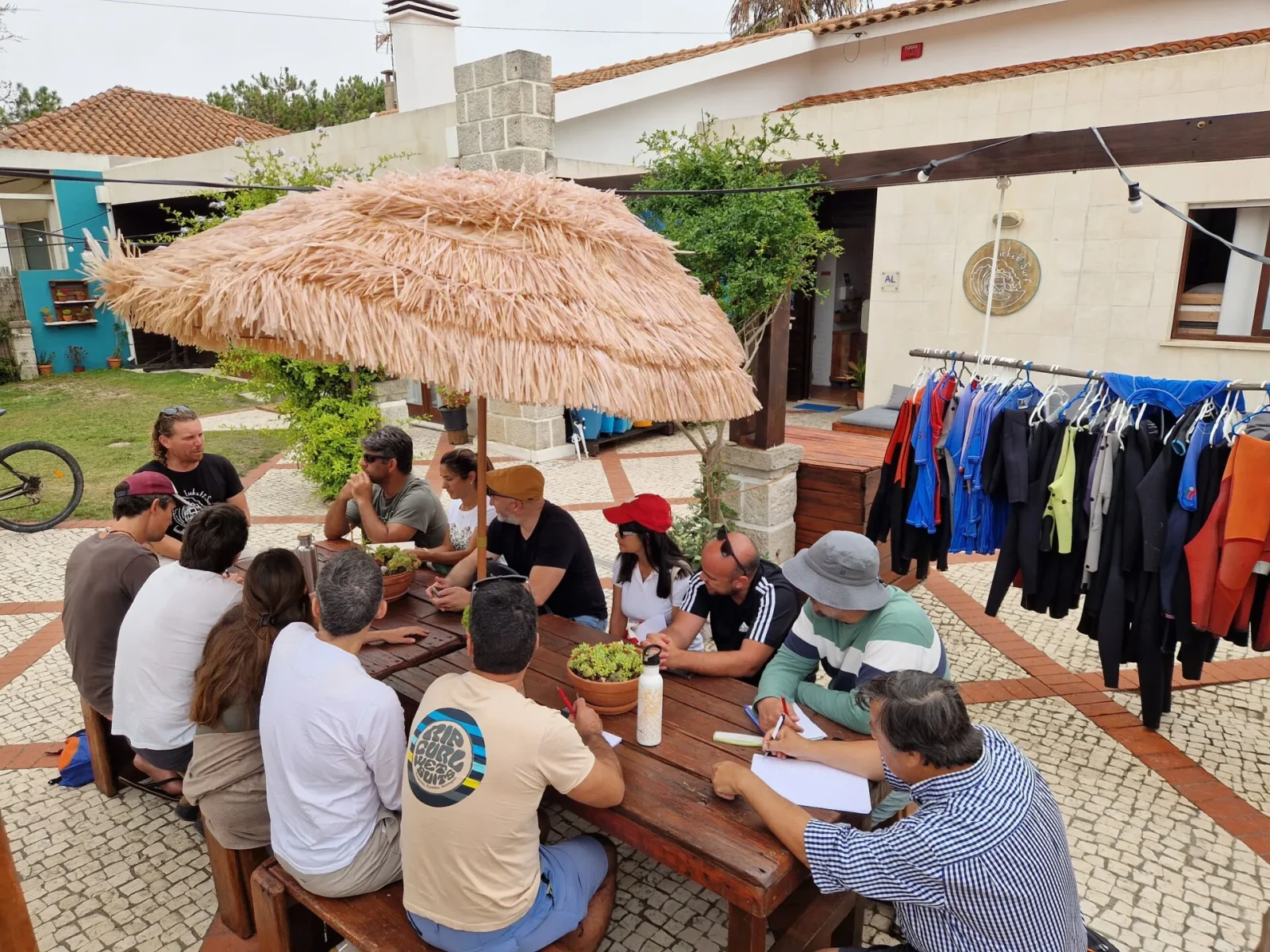 The 3th visit took place at Dreamsea Surf Camps (Praia da Tocha), also being the first partner Olmo used to work with at SurfaWhile. Country Manager (Portugal) Diogo told us all about the camp, its worldwide presence (16 locations) and how to have been able to increase their standards throughout the years. The camp (hosting up to 90 guests) was beautiful and the students were truly interested in seeing the tents, the dining area, the weekly schedule, the surf corner and the (self created) bathroom facilities. Picture below of the visit and header photo of host Diogo (country manager Dreamsea Portugal).